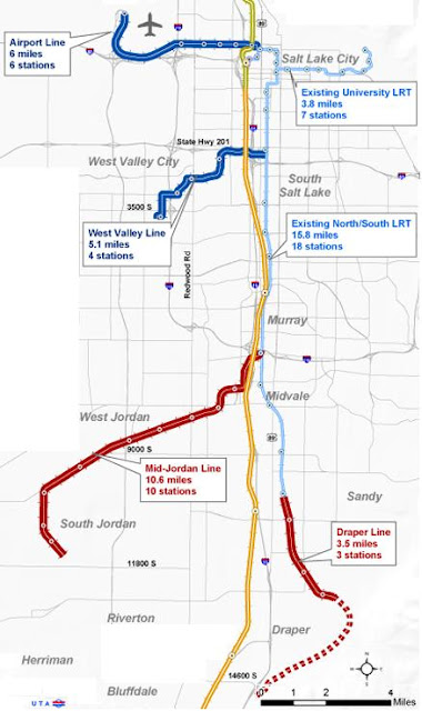 Here is an update on the contruction progress: Nearly all of the track for the line has been laid. The future station platforms have already been constructed at all 10 stations, and several Park & Ride lots have been completed. TRAX bridges are in place at Winchester Street, 7200 South, 700 West, the Jordan River, 7800 South, the Utah/Salt Lake Canal and Bangerter Highway. All 16 noise barriers are also installed and nearly all grade crossings are complete. Future projects will include the installation of overhead catenary system poles and wires, and the installation and testing of railway signaling equipment.