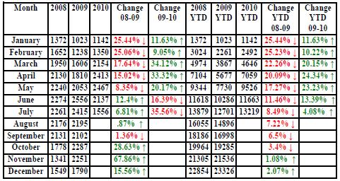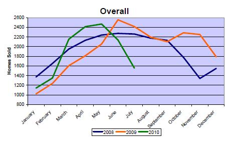 This is a graph of how many homes sold across the Wasatch Front. The Green line represents the sales this year. The orange line is 2009 and the blue line is 2008.