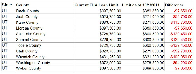 Congress has proposed new limits on FHA loans. How will this affect people in Utah? It will reduce your purchasing power is some price ranges. If you want to purchase a home in Salt Lake county close to $600,000, or if you are intending to purchase a home in Utah county anywhere above $270,000, you may not be able to get FHA financing. Anyone who wants to purchase a home above the FHA limit will have to get a conventional loan for that house. Conventional loans have more strict requirements, and may have a higher rate. One thing for sure, you WILL be required to make a larger down payment for a conventional loan.
